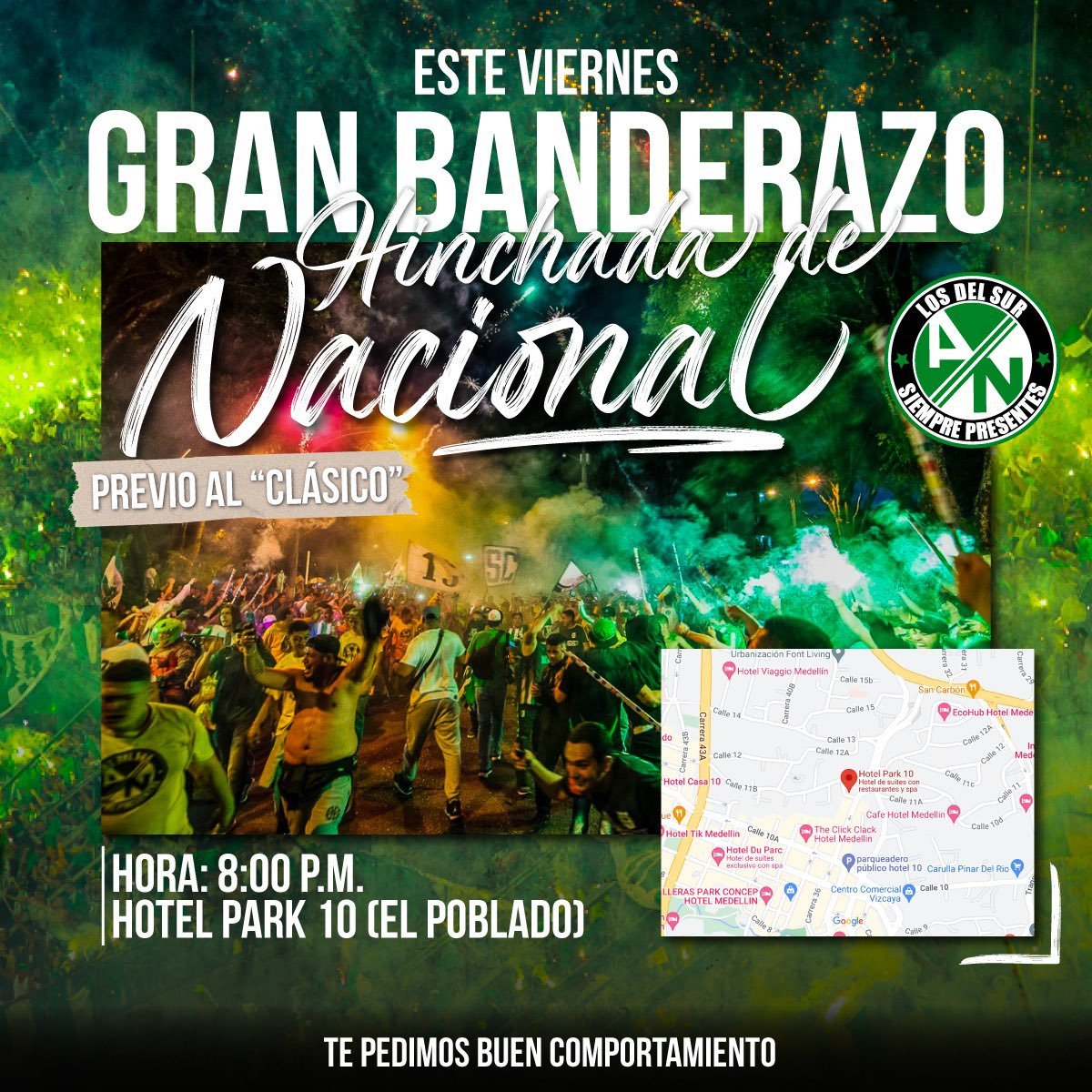 Los del Sur, barra oficial de Atlético Nacional, convocaron a toda la hinchada verdolaga para acercarse este viernes en la noche al Hotel Park10 donde concentra el plantel previo al clásico ante Independiente Medellín, con la idea de alentar y motivar al equipo para el compromiso.