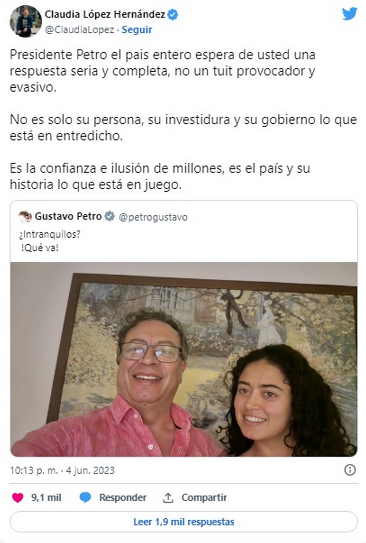 La alcaldesa de Bogotá, Claudia López, le pidió al presidente Gustavo Petro que de “respuesta sería” ante el escándalo de audios de los que salieron a luz pública el pasado domingo.