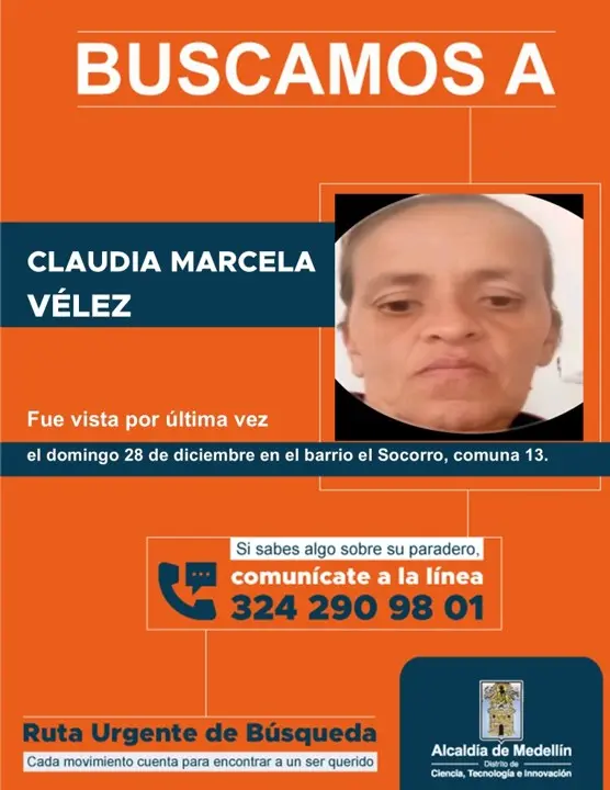 Minuto30.com .- La familia de Claudia Marcela Vélez se encuentra en una búsqueda incansable tras perder su rastro en el occidente de Medellín. Según el reporte de sus allegados, la mujer fue vista por última vez el pasado domingo 28 de diciembre en el barrio El Socorro, perteneciente a la Comuna 13.