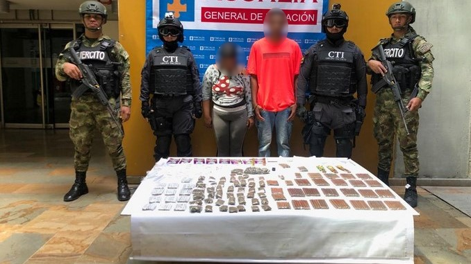 En un operativo, realizado por el grupo Antinarcóticos y Tareas Especiales del CTI Medellín con apoyo del Batallón de Policía Militar No.4, fueron capturados un hombre y una mujer, y allí se les hallaron en total 319 dosis de marihuana, 46 dosis de clorhidrato de cocaína y 09 pastillas de rivotril.