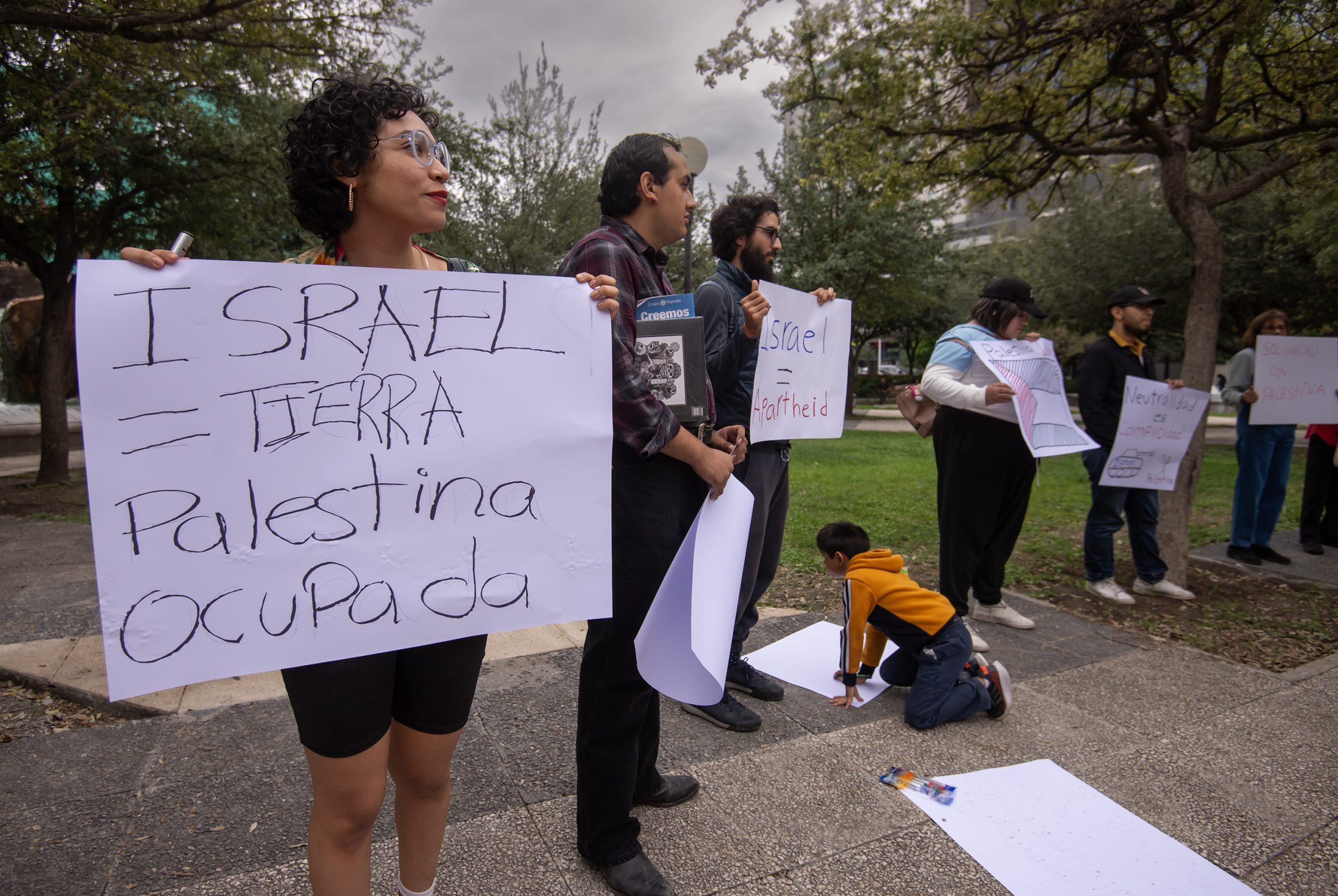 Los manifestantes se reunieron en uno de los accesos principales del Centro Internacional de Negocios (Cintermex) y llevaban pancartas en las que podían leerse frases como “Solidaridad con Palestina” y “Alto a la masacre en Gaza”.