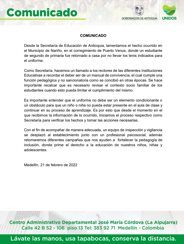 “Es importante entender que el uniforme no debe ser un elemento condicionante o un obstáculo para que un niño o niña no pueda estar presente en el aula de clase y continuar en su proceso de aprendizaje. Es por esto que desde el momento en el que recibimos la información de lo ocurrido, iniciamos el proceso respectivo como Secretaría para verificar los hechos y tomar las acciones necesarias”, precisó la Secretaría.