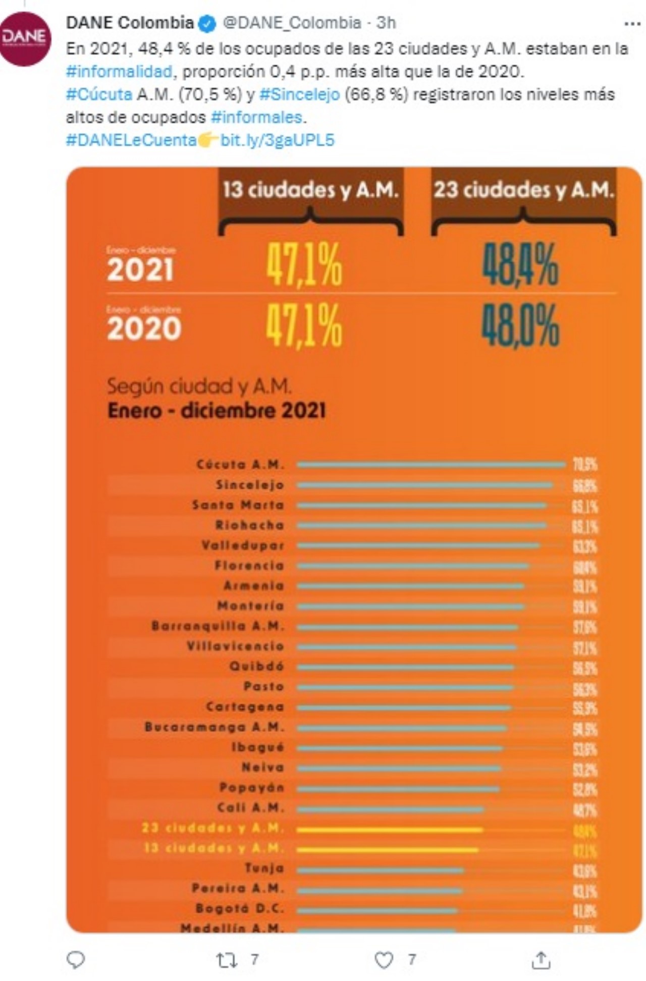 Para el periodo en mención, la entidad indicó que “en 2021, la población ocupada del país fue 21,1 millones de personas, lo que significa una variación positiva de 6,3% frente a las 19,9 millones de 2020”.