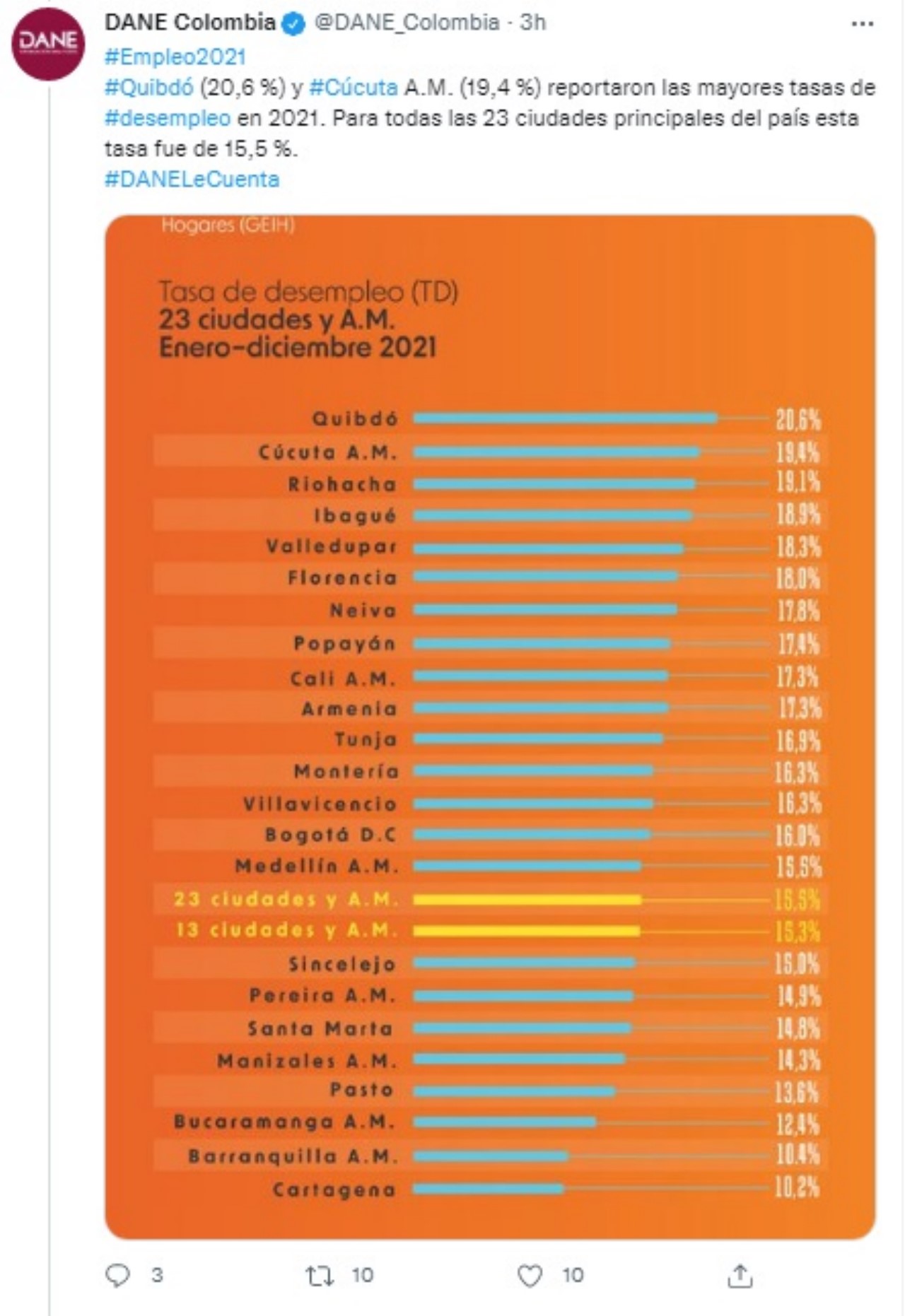 De acuerdo con el Departamento Administrativo Nacional de Estadística (DANE), la tasa de desempleo entre enero y diciembre de 2021 fue 13,7%, generando una disminución de 2,2 puntos porcentuales frente al año 2020, cuando se fijó en 15,9%.
