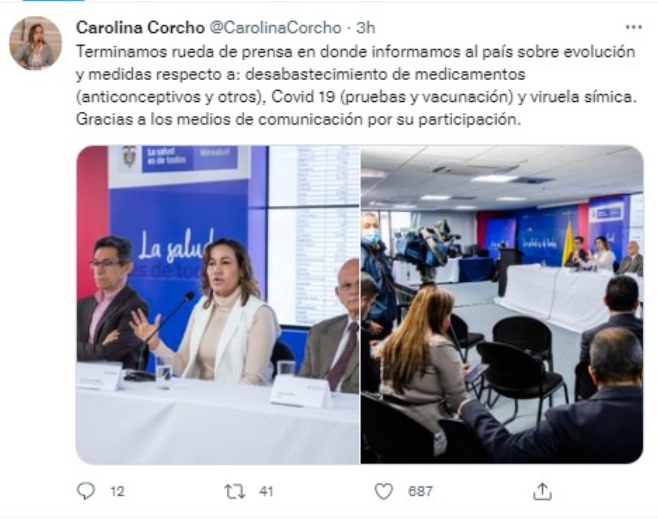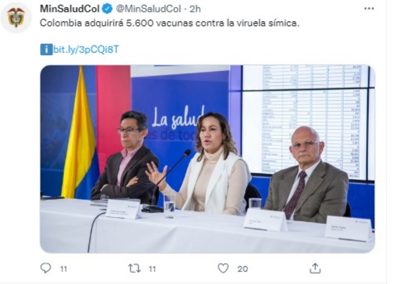 Durante la rueda de prensa ofrecida en la mañana de este martes, la ministra de Salud y Protección Social, Carolina Corcho, afirmó que el país adquirirá 5.600 vacunas contra la viruela símica.