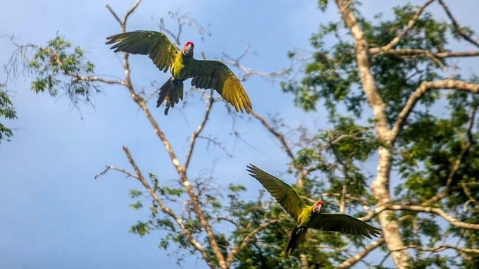 Fotografía de este 18 de mayo de 2015 que muestra varios guacamayos verde limón (Ara ambiguus). EFE