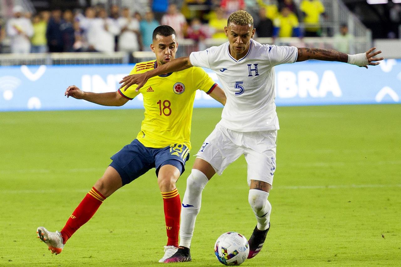 Fotografía cedida por la Federación Colombiana de Fútbol que muestra al jugador Daniel Giraldo de Colombia (i) mientras disputa el balón con Kervin Arriaga de Honduras (d) durante el partido amistoso jugado hoy, en el DRV PNK Stadium de Fort Lauderdale (Estados Unidos). EFE/ Federación Colombiana de Fútbol