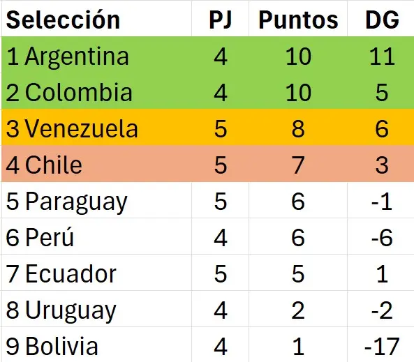 Argentina también salió victoriosa de su visita a Chile en Valparaíso entre Chile y, segundo y tercero en este momento, los dejaría con 8, al igual que a Venezuela.