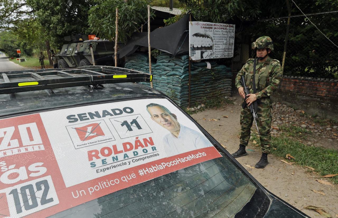 Fotografía de archivo fechada el 17 de febrero de 2022 que muestra a un soldado mientras realiza un control a un vehículo con publicidad electoral, en Saravena, departamento de Arauca (Colombia). EFE/Mauricio Dueñas Castañeda