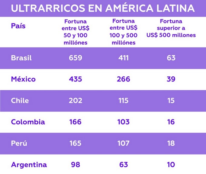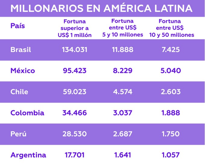 Brasil, México, Chile, Colombia, Perú y Argentina son los países donde hay más de 1.700 ciudadanos caudalosos que sus patrimonios están entre 50 y 100 millones de dólares, y 161 superan los 500 millones de dólares