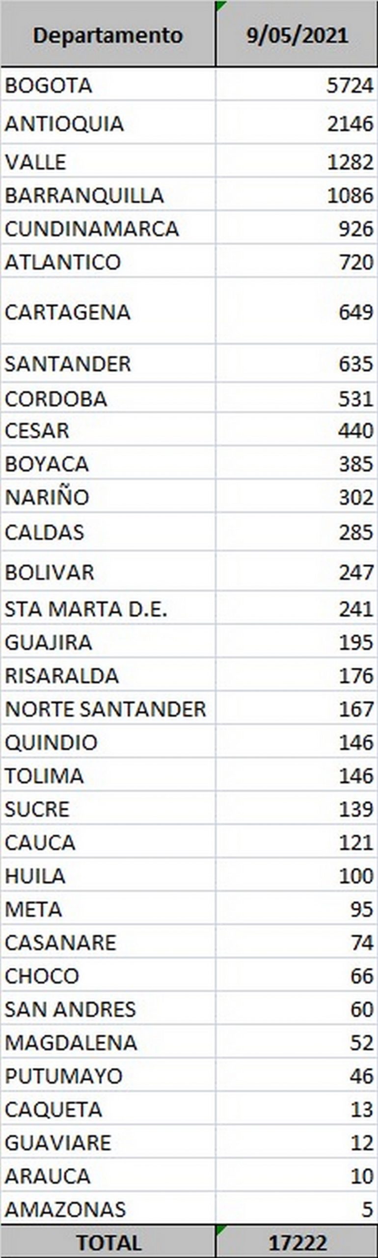 95.078 casos activoshttps://t.co/SiKTpTCQ3W pic.twitter.com/SrkToSoIwW— MinSaludCol (@MinSaludCol) May 9, 2021