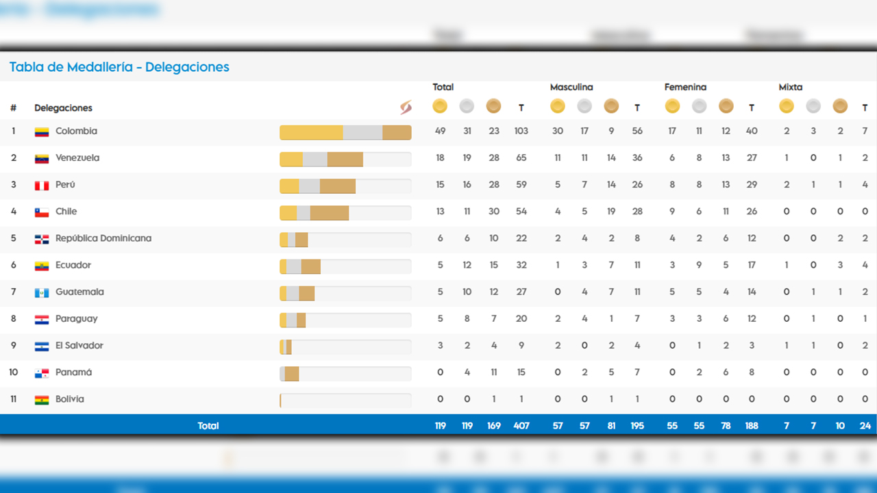 Así las cosas, Colombia continúa en el primer lugar de la tabla de medallería con 49 medallas de oro, Venezuela es segundo con 18 y Perú tercera con 15.