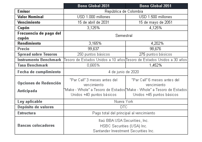 Colombia realizó una exitosa emisión de títulos de deuda en los mercados internacionales, que consisten en la colocación de un nuevo bono con vencimiento en 2031 a una tasa de interés de 3,165% (tasa cupón de 3,125%) y un nuevo bono con vencimiento en 2051 a una tasa de interés de 4,202% (tasa cupón de 4,125%), con el objetivo de financiar apropiaciones presupuestales de este 2020.