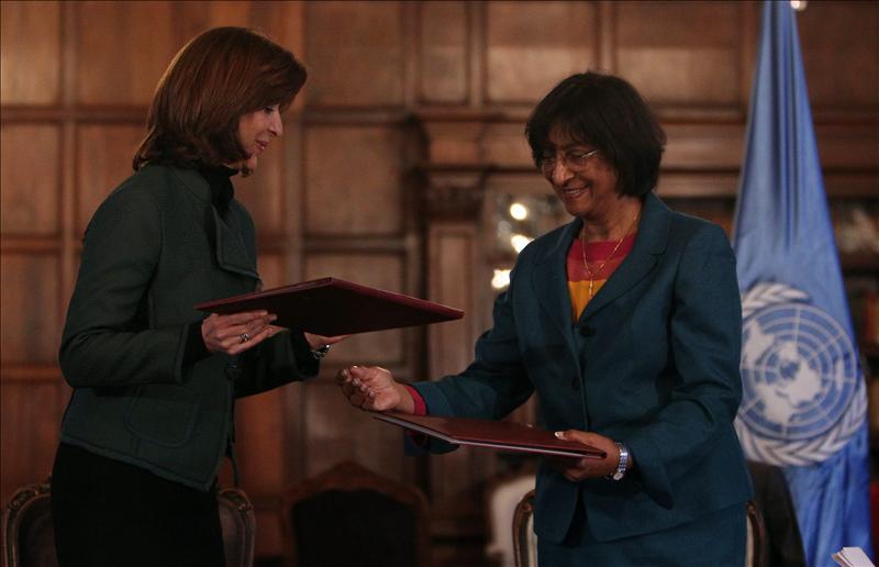 La ministra colombiana de Relaciones Exteriores, María Ángela Holguín (i), y la alta comisionada de las Naciones Unidas para los Derechos Humanos, Navi Pillay (d), intercambian documentos firmados el 18 de julio de 2013, en Bogotá (Colombia). EFE