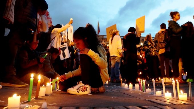 Con banderas de Colombia y de diferentes movimientos políticos, globos blancos y pancartas, miles de colombianos se reunieron esta noche en la céntrica Plaza de Bolívar de Bogotá y en distintas ciudades del país para prender velas en memoria de los líderes sociales asesinados y rechazar los crímenes.