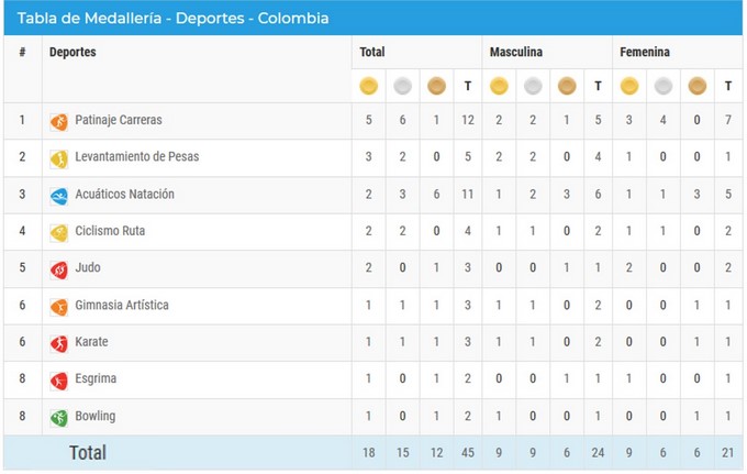 Patinaje de carreras; levantamiento de pesas; natación; judo; gimnasia artística; karate, esgrima y bowling son los deportes que han bañado de oro a Colombia.