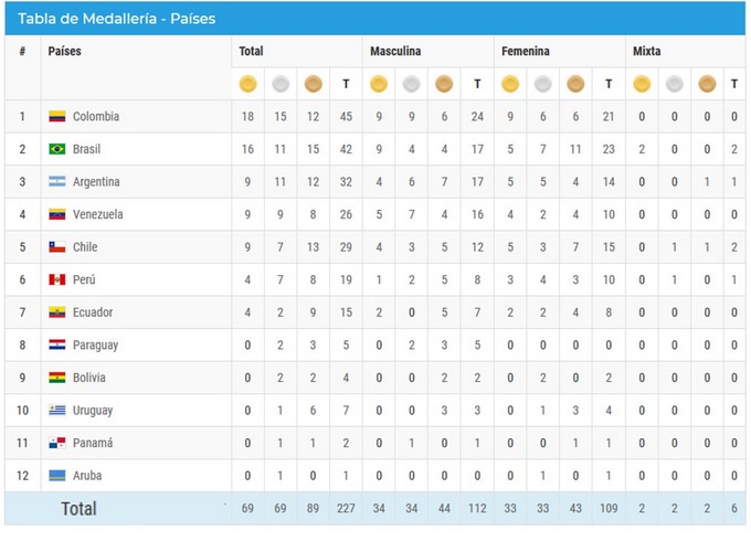 Brasil con 16 de oros es el segundo en la tabla, y Argentina escolta a la verdeamarela con 9 oros.