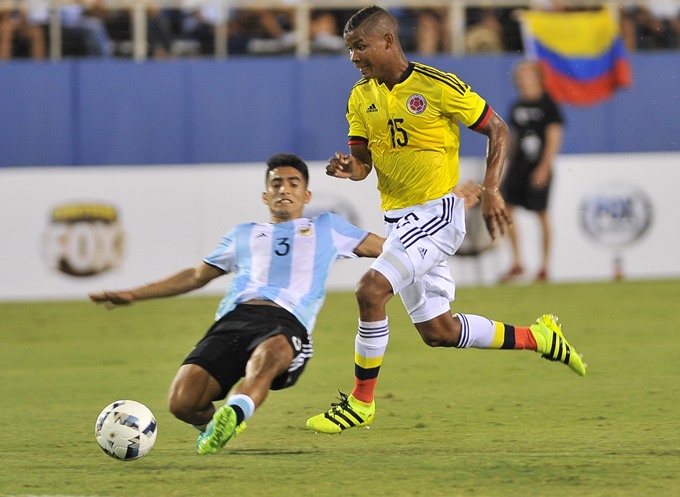 FLO01. BOCA RATÓN (ESTADOS UNIDOS), 21/07/2016.- Alexis Soto (i) de Argentina disputa el balón contra Wilmar Barrios (d) durante un partido preolímpico amistoso entre Colombia y Argentina en el FAU Stadium de Boca Ratón, Florida (Estados Unidos) hoy, jueves 21 de julio de 2016. EFE/GASTÓN DE CÁRDENAS