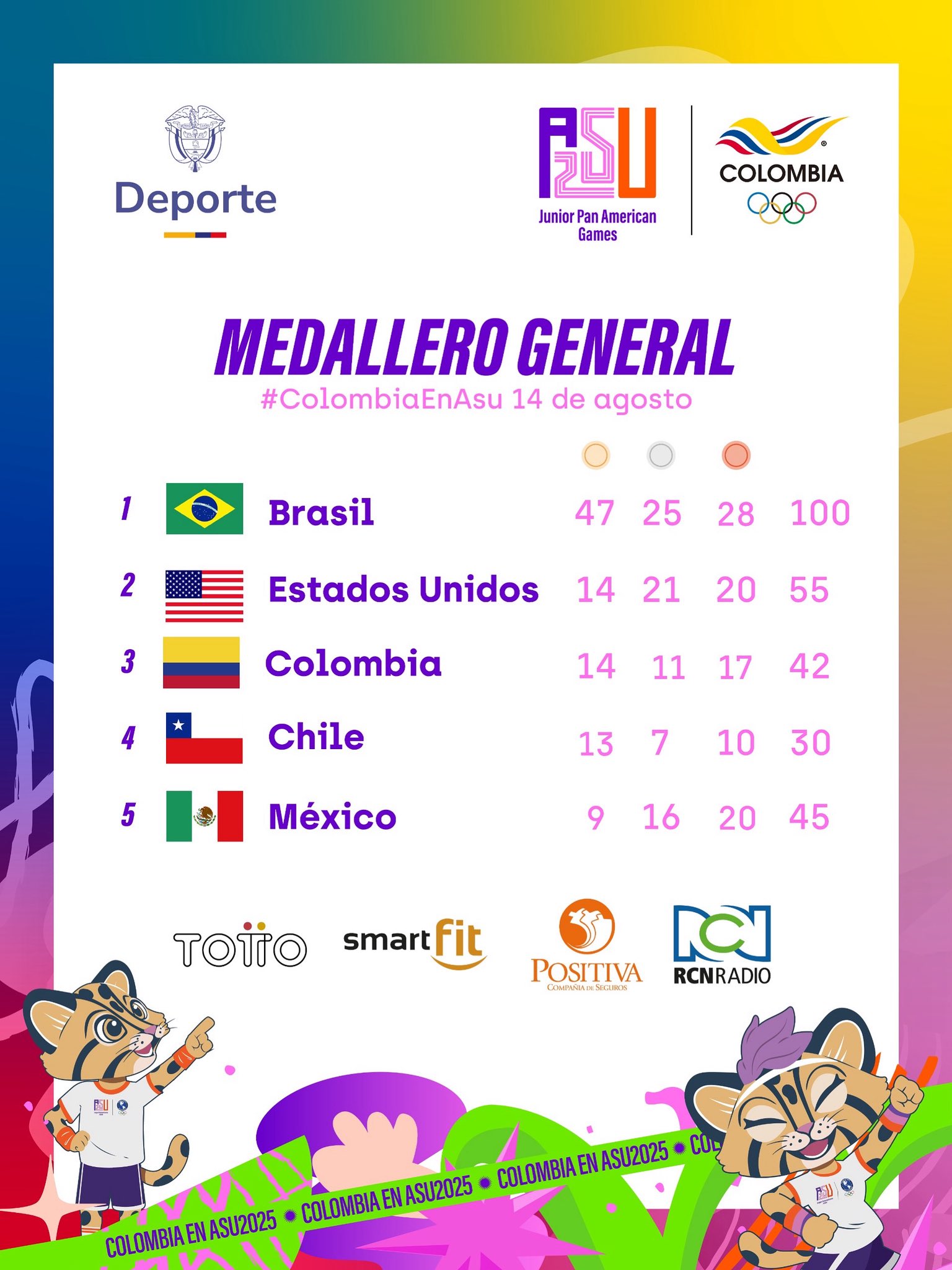 ❤️ ¡Colombia sube al podio del medallero! Con 14 oros, 11 platas y 17 bronces nuestra delegación se ubica tercera en #Asu2025. Seguimos sumando historia en Paraguay. pic.twitter.com/lwvDmoqFLj