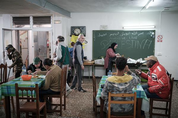 En este comedor sin normas más allá del respeto mutuo atienden a todo aquel que acuda a las 12.30 horas al local, donde no hay lemas políticos aunque sí hay una pizarra escolar donde estas semanas se ha escrito con tiza el lema 'Vida para Palestina' en vez de colocar el nombre de los donantes de comida.