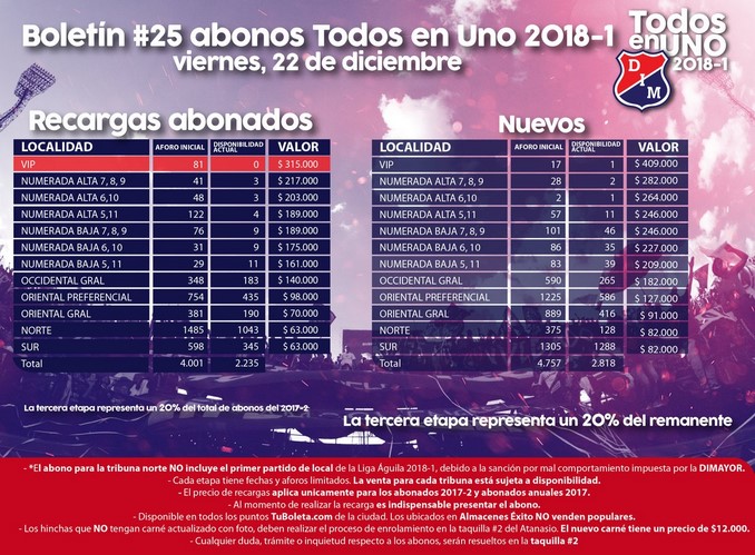Así las cosas, los hinchas del ‘Equipo del Pueblo’ que tengan entre los planes abonarse, deben hacerlo lo más pronto que puedan, pues entre más avancen las etapas y se acerque la fecha de inicio de los campeonatos, menores serán los descuentos.