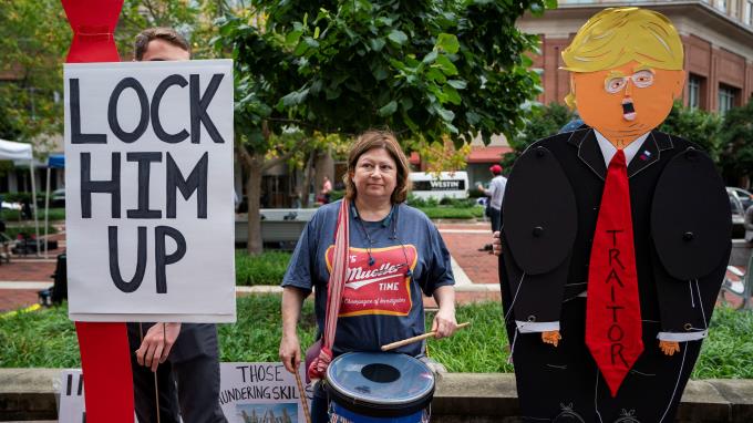 Manifestantes esperan el inicio del primer día de juicio del exjefe de campaña del presidente Donald Trump, Paul Manafort, en Alejandría, Virginia, Estados Unidos, este 31 de julio de 2018. EFE