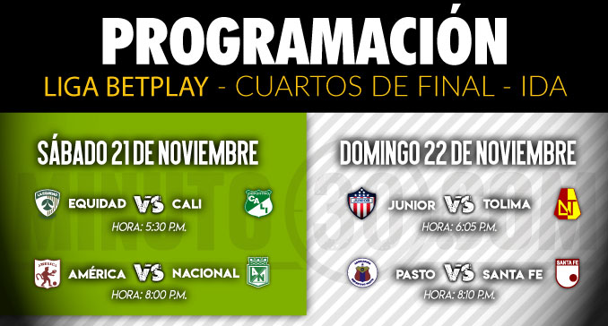 A las 6:05 p.m. rivalizarán en el Estadio Metropolitano Atlético Junior y Deportes Tolima, mientras que a las 8:10 se medirán Deportivo Pasto e Independiente Santa Fe.