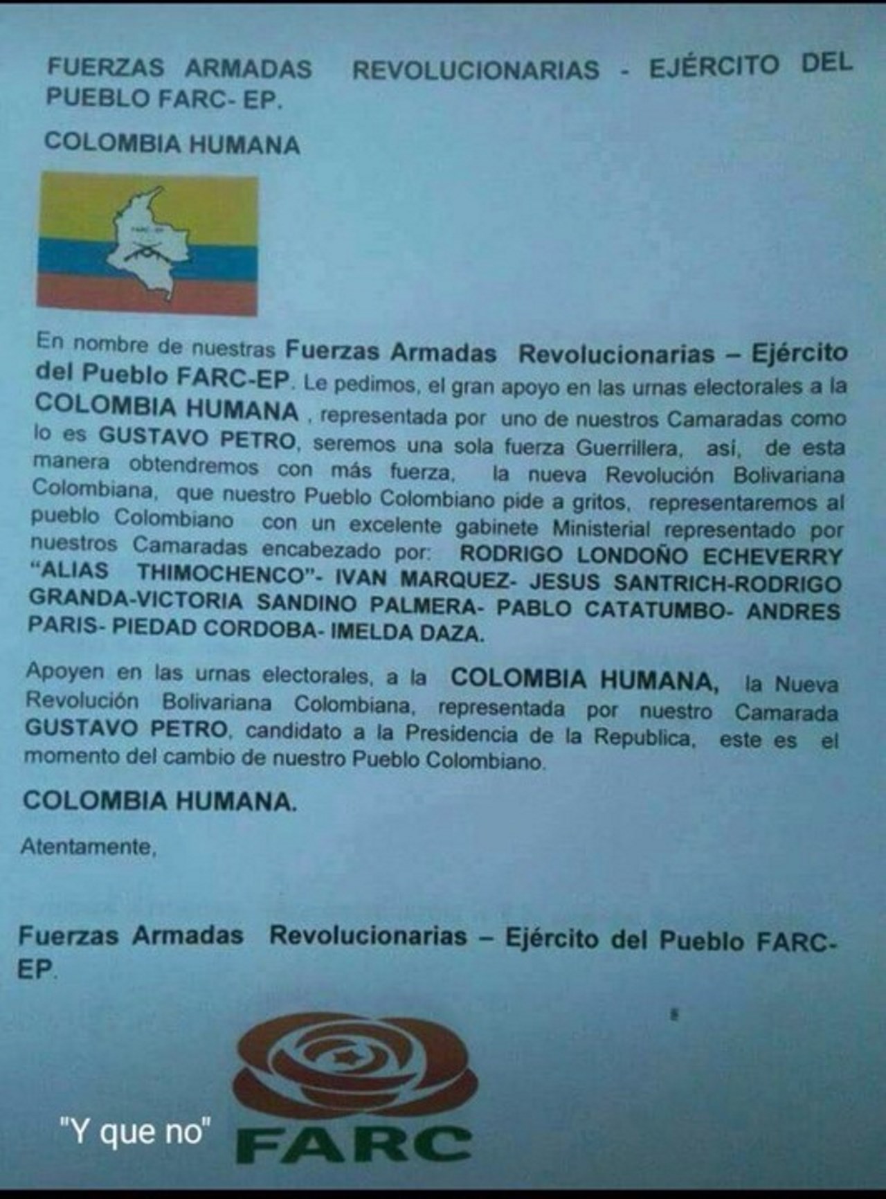Usuarios en Twitter y Facebook comparten un documento atribuido a las FARC que anima a votar por el candidato presidencial Gustavo Petro. «Apoyen en las urnas electorales a la Colombia Humana, la Nueva Revolución Bolivariana Colombiana, representada por nuestro Camarada Gustavo Petro, candidato a la Presidencia de la República», afirma la carta.