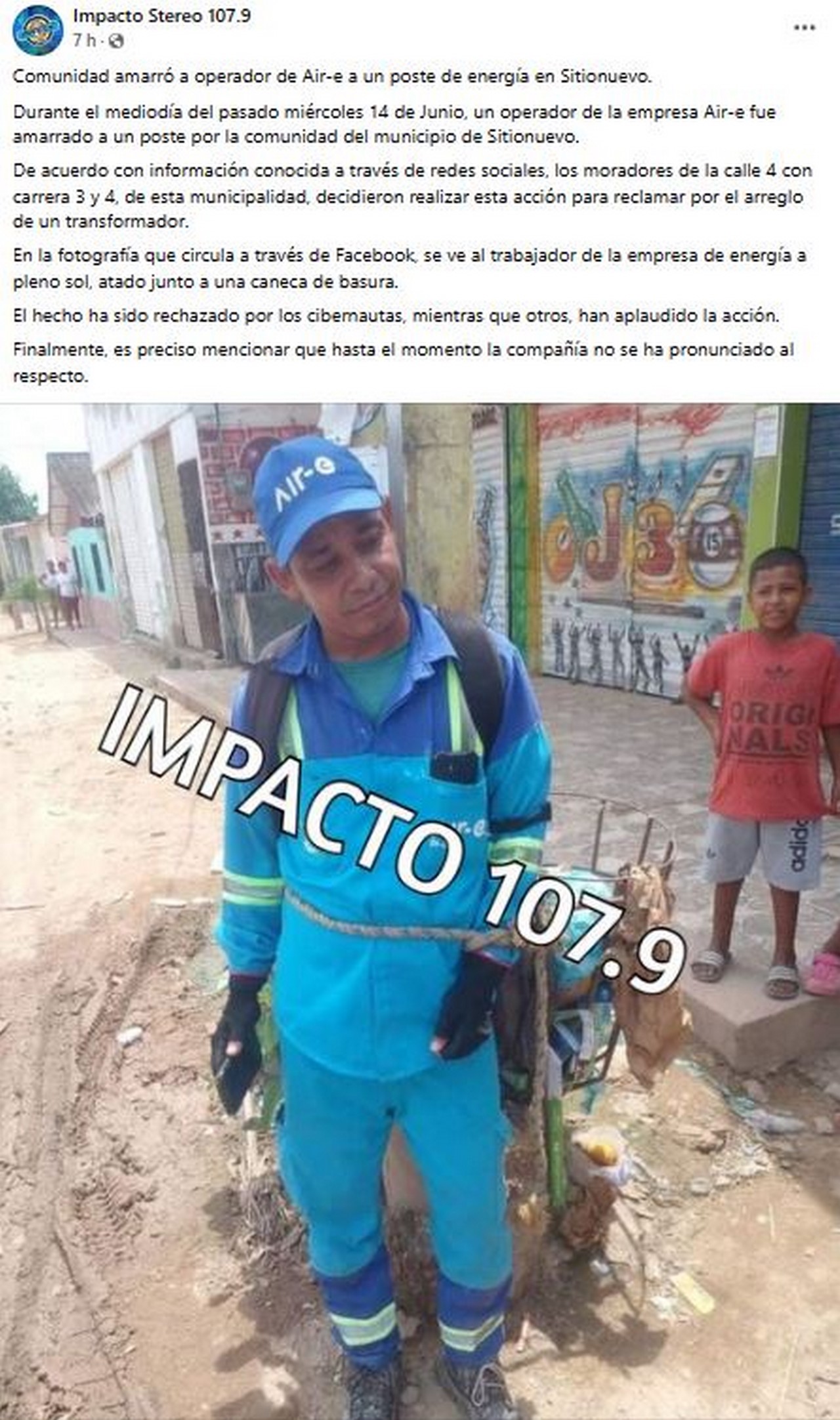 Cansados por los recortes de luz, la comunidad de Sitionuevo, Magdalena, ataron a un poste de luz a un trabajar de la empresa de energía.
