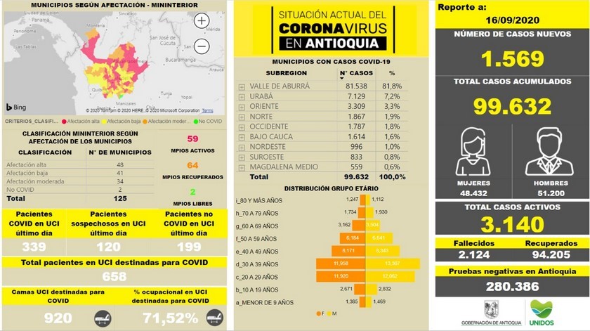 La Secretaría Seccional de Salud y Protección Social de Antioquia informó que se presentaron 1.569 casos nuevos registrados de contagiados por Covid-19 en el departamento y se eleva a 99.632.