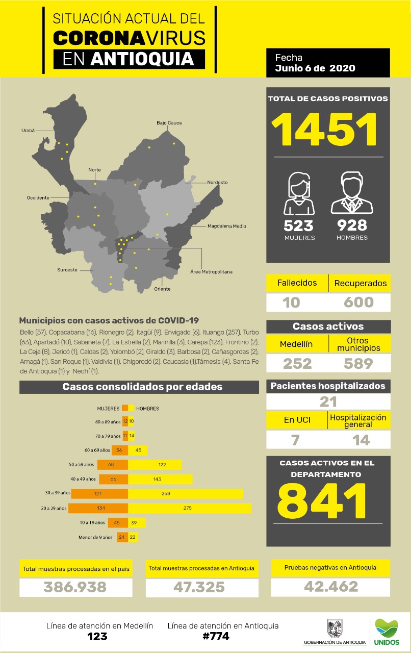 Todos estos nuevos casos fueron previamente identificados, puestos en aislamiento y bajo la vigilancia epidemiológica correspondiente. Con estos nuevos casos, la cifra de personas contagiadas en Antioquia se eleva a 1451. De ellos 523 son mujeres y 928 son hombres.