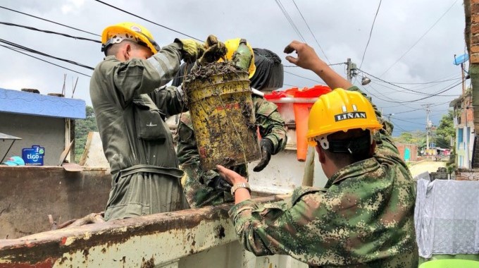 Ingenieros Militares del Batallón Baraya, unidad adscrita a la Sexta Brigada, iniciaron labores de remoción de escombros y desechos presentes en algunas viviendas de los barrios 7 de agosto y 20 de julio de Ibagué, producto de los deslizamientos originados por las fuertes lluvias ocurridas recientemente en la ciudad.
