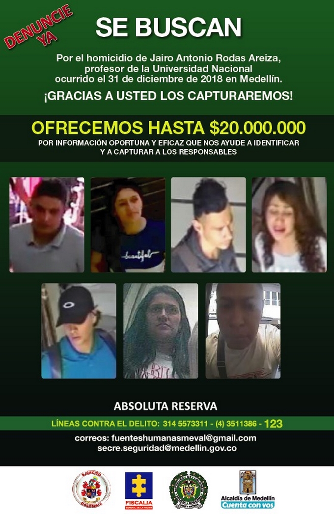 El secretario de Seguridad de Medellín, Andrés Tobón, informó que fueron reconocidas siete personas quienes serían los responsables del asesinato al profesor Jairo Rodas Areiza, y por eso, se dispuso de un cartel con el que los ciudadanos podrán ayudar a encontrar a los responsables y se ofreció una cuantiosa recompensa que permita dar con su paradero.