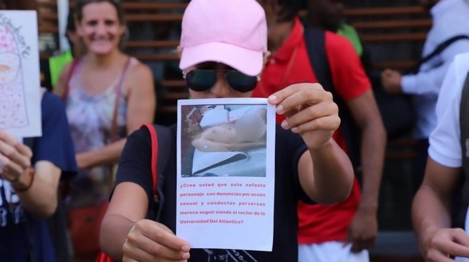 Estudiantes de la Universidad del Atlántico le pidieron al Consejo Superior de la institución por medio de un plantón la renuncia del rector quien fue denunciado recientemente por presunto acoso sexual y del cual muestran una foto desnudo, al parecer, en un motel durante la marcha.