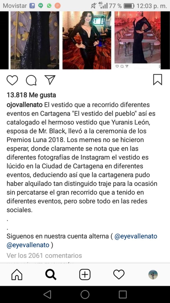 El medio de difusión apuntó que así era “catalogado el hermoso vestido que Yuranis León, esposa de Mr. Black, llevó a la ceremonia de los Premios Luna 2018”, y afirmó que “la cartagenera pudo haber alquilado tan distinguido traje para la ocasión sin percatarse el gran recorrido que ha tenido en diferentes eventos, pero sobre todo en las redes sociales”.