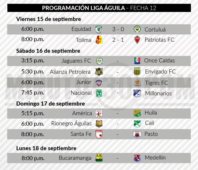 Luego del receso de la Liga Águila II-2017, con motivo de la visita del Papa Francisco, con dos partidos comenzó el viernes la fecha 12 del campeonato que se torna bastante decisiva dada la cercanía de los equipos en la tabla de posiciones.