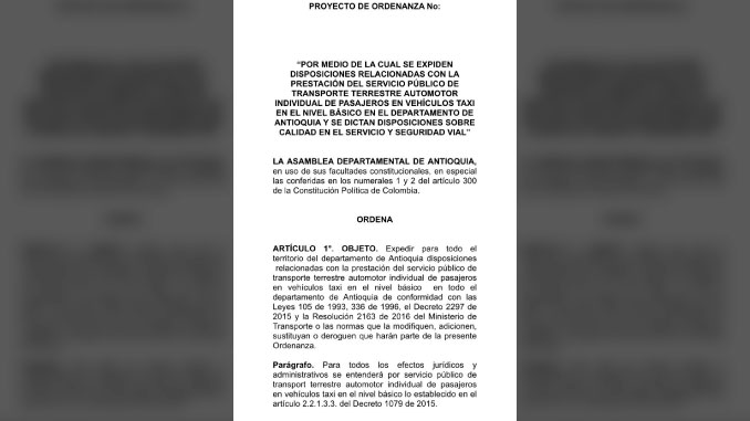 En la Asamblea de Antioquia se debate la ordenanza por medio de la cual se reglamentará el servicio de taxis en el Departamento, con el propósito de mejorar la calidad en la prestación del mismo.