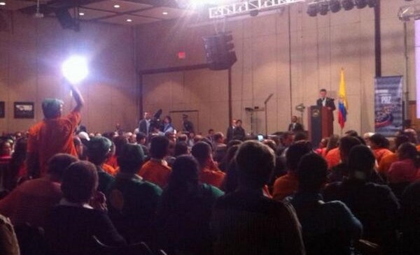 Juan Manuel Santos, manifestó que “‘No se pueden reparar a todas las víctimas al mismo tiempo’, a lo que uno de los asistentes se levantó y le dijo que “no tenía derecho a hablar de paz y reparación a las víctimas porque su gobierno estaba financiando las vacaciones a las Farc en La Habana”.