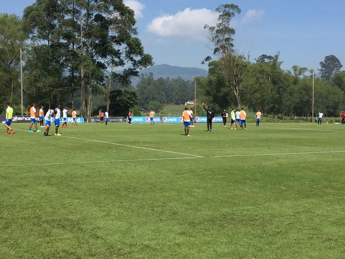 Para el inicio de la práctica el entrenador Ismael Rescalvo se apoyó en un tablero grande, para exponer las indicaciones de cara al entrenamiento matutino, lo que es poco habitual cuando ya están en el campo.