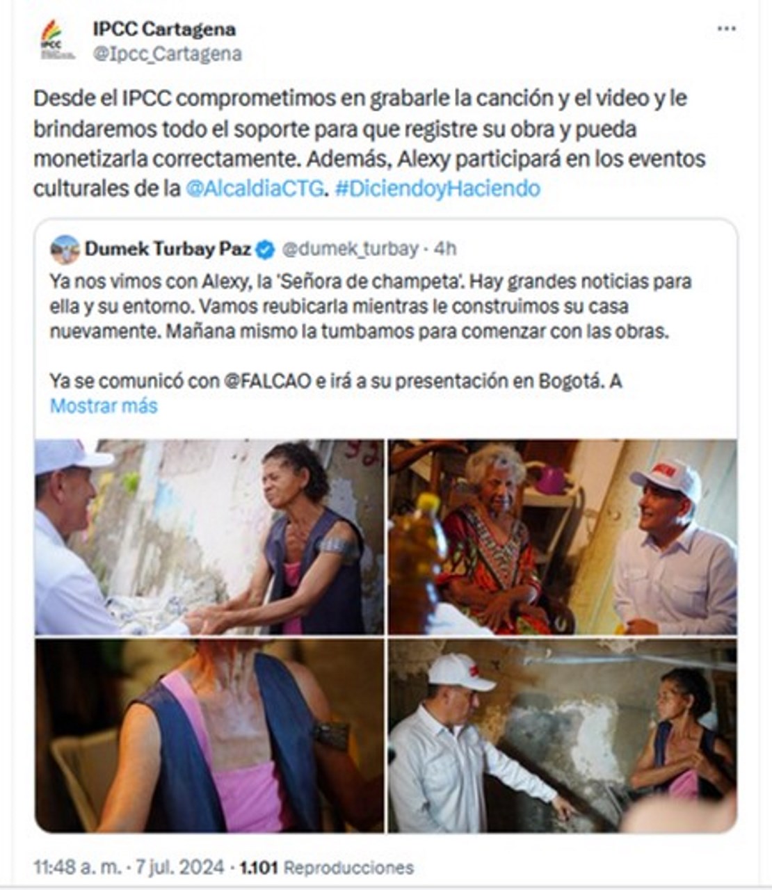 Durante su visita a la artista, el alcalde de Cartagena se mostraba orgullosos del talento de la cartagenera y le dio varias grandes noticias: “Vamos reubicarla mientras le construimos su casa nuevamente. Mañana mismo la tumbamos para comenzar con las obras”.