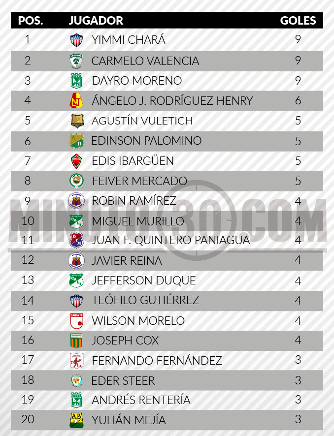 Yimmi Chará, de Atlético Junior; Carmelo Valencia, de La Equidad; y Dayro Moreno, de Atlético Nacional, se mantienen en la cima del escalafón con 9 goles cada uno.