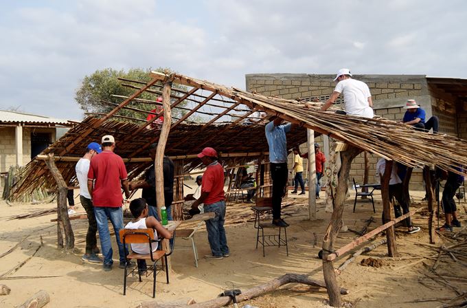 Los participantes arreglan pupitres, pintan paredes, levantan una choza.