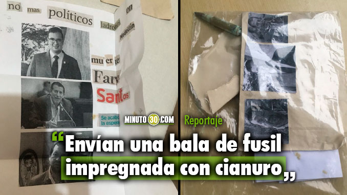 Tres Concejales de Medellín, pertenecientes al Partido de la U, recibieron este viernes un sobre con una amenaza, la cual consiste en las fotografías de Manuel Alejandro Moreno, Ramón Emilio Acevedo y Jesús Aníbal Echeverri acompañadas de una bala de fusil impregnada con cianuro y el mensaje “no mas políticos ladrones en Medellín muerte Farc Santos se les acabó la espera”.
