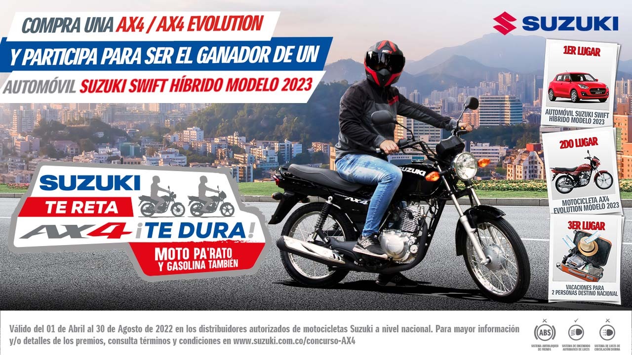 Con el concurso “Suzuki te reta, AX4 ¡Te dura!, la marca de motocicletas y también vehículos le brinda a sus usuarios tres grandes chances de ser los felices ganadores de imperdibles premios, que van desde un automóvil cero kilómetros hasta un viaje.