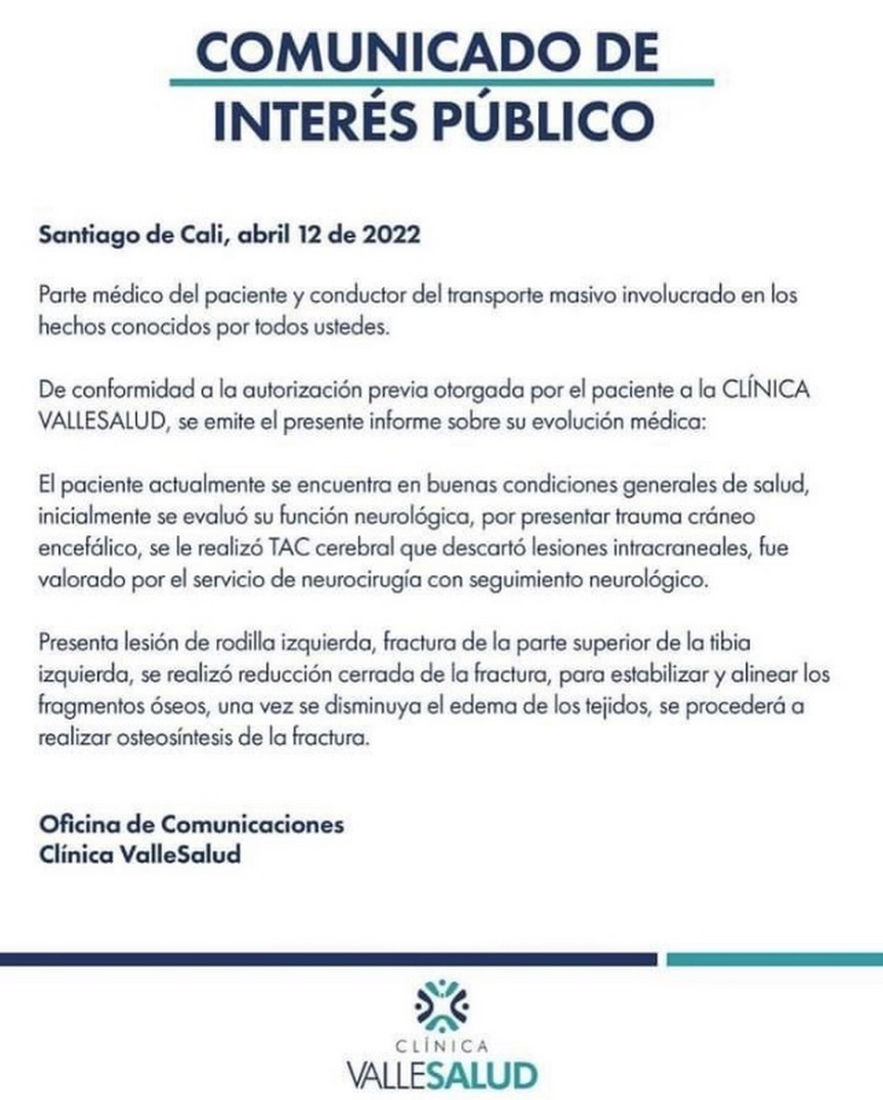 Además, descartaron lesiones intracraneales y el seguimiento neurológico es satisfactorio, aseguró Carlos Fernando López, Director Médico de la Red Vallesalud.