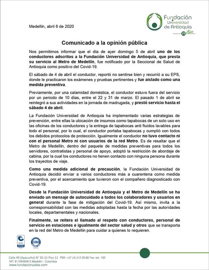 La Fundación de la Universidad de Antioquia indicó que el conductor habría estado por fuera de sus servicios durante 10 días, debido a una calamidad doméstica y regresó a su trabajo el pasado 1 de abril: “El pasado 1 de abril se reintegró a sus actividades en jornada de madrugada y prestó servicio hasta el sábado 4 de abril”, señaló el comunicado.