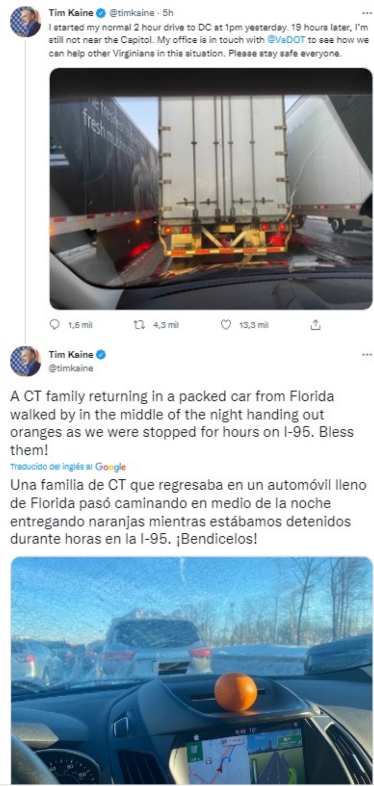 A través de su cuenta de Twitter manifestó: “Comencé mi viaje normal de 2 horas a DC a la 1 pm ayer. 19 horas después, todavía no estoy cerca del Capitolio. Mi oficina está en contacto con Departamento de Transporte de Virginia (VDOT, por sus siglas en inglés) para ver cómo podemos ayudar a otros virginianos en esta situación. Por favor, manténganse a salvo todos”.