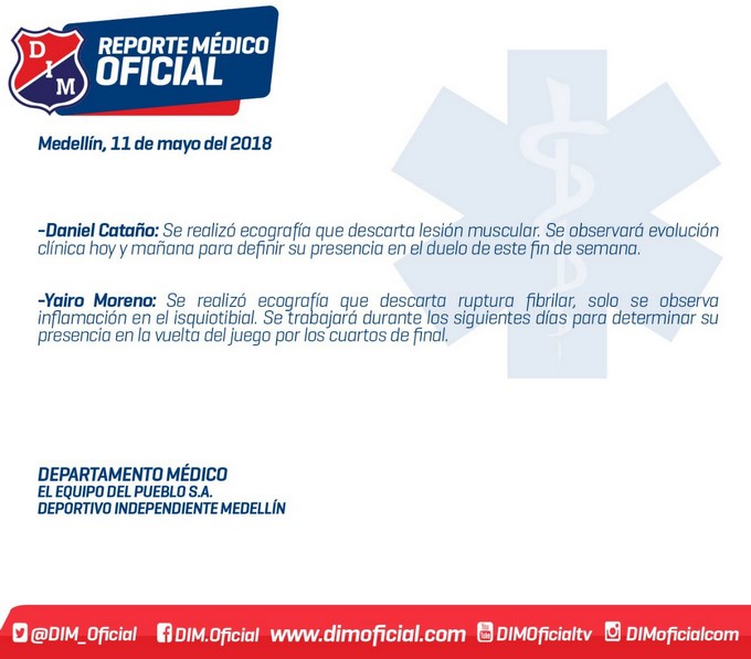 El club antioqueño ha confirmado que en el caso de Moreno, aunque no presenta ruptura, su complicación lo dejará por fuera del partido de ida de los cuartos de final de Liga Águila ante el Junior y se estudia si estaría para la vuelta.
