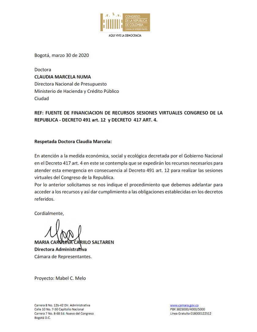 La carta está firmada por Carolina Carrillo, directora administrativa de la Cámara de Representantes, en la que se expresa que en virtud de los decretos expedidos por el Gobierno “solicitamos se nos indique el procedimiento que debemos adelantar para acceder a los recursos y así dar cumplimiento a las obligaciones establecidas en los decretos referidos”.