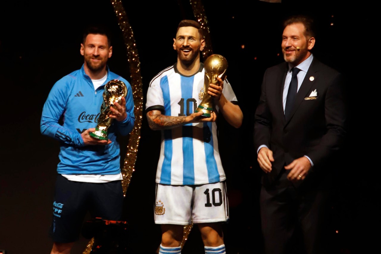Lionel Messi (i) de Argentina posa junto a una estatua suya acompañado por el presidente de la Conmebol Alejandro Domínguez (d) este 27 de marzo de 2023, durante La noche de las Estrellas de Conmebol. EFE/ Fernando Franceschelli